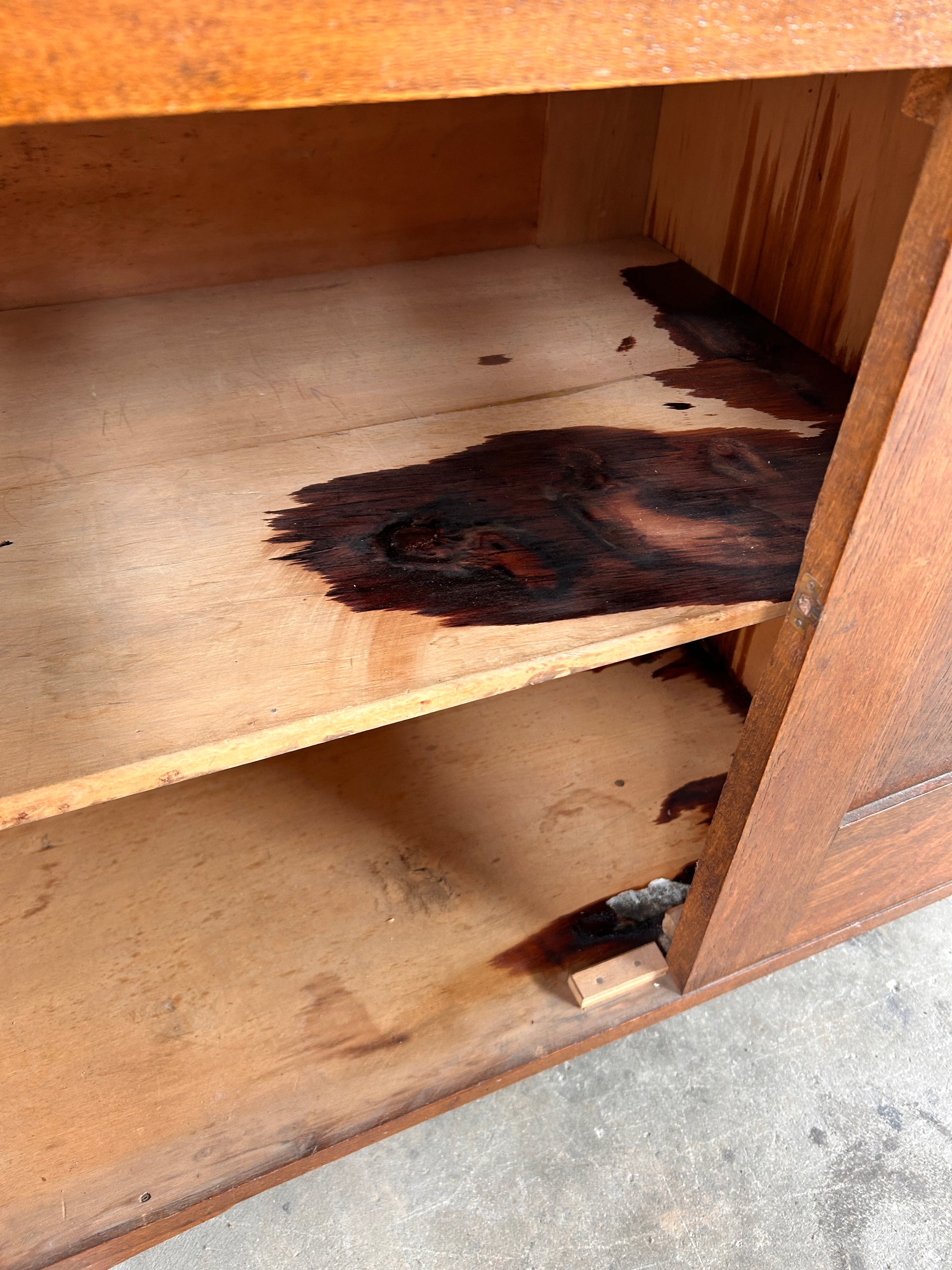 Featuring two deep drawers which slide perfectly & two doors which all have the original hardware. The cupboards feature a single fixed shelf and are seperate cupboards with a divider. There is a significant stain in side the left cupboard - cosmetic only doesn’t affect use.