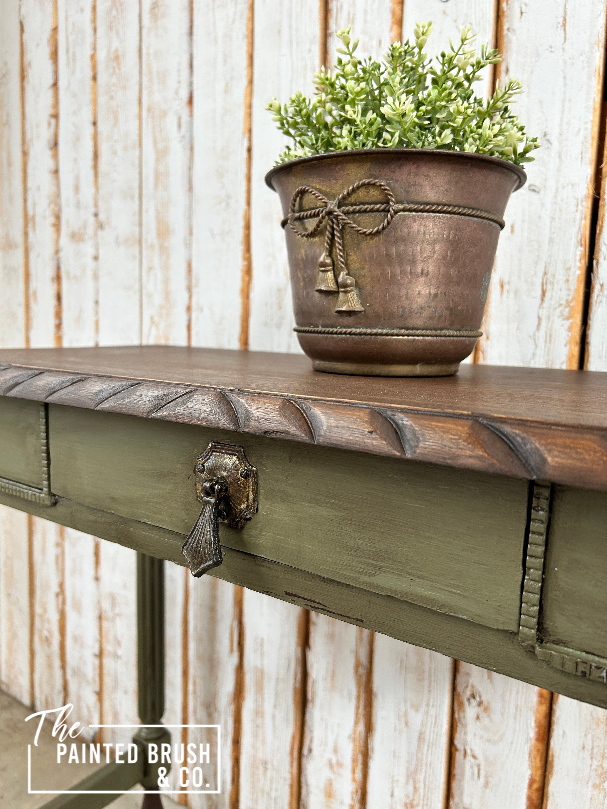 This sweet hall table was in disrepair when it came to me, falling apart, missing pieces and failing finish. It has been rebuilt and completely refinished. Painted with Pureco Silk Finish - Vineyard a beautiful vintage green and glazed with Pureco Stain & Glaze Sable for a faux aged finish with a small amount of distressing.