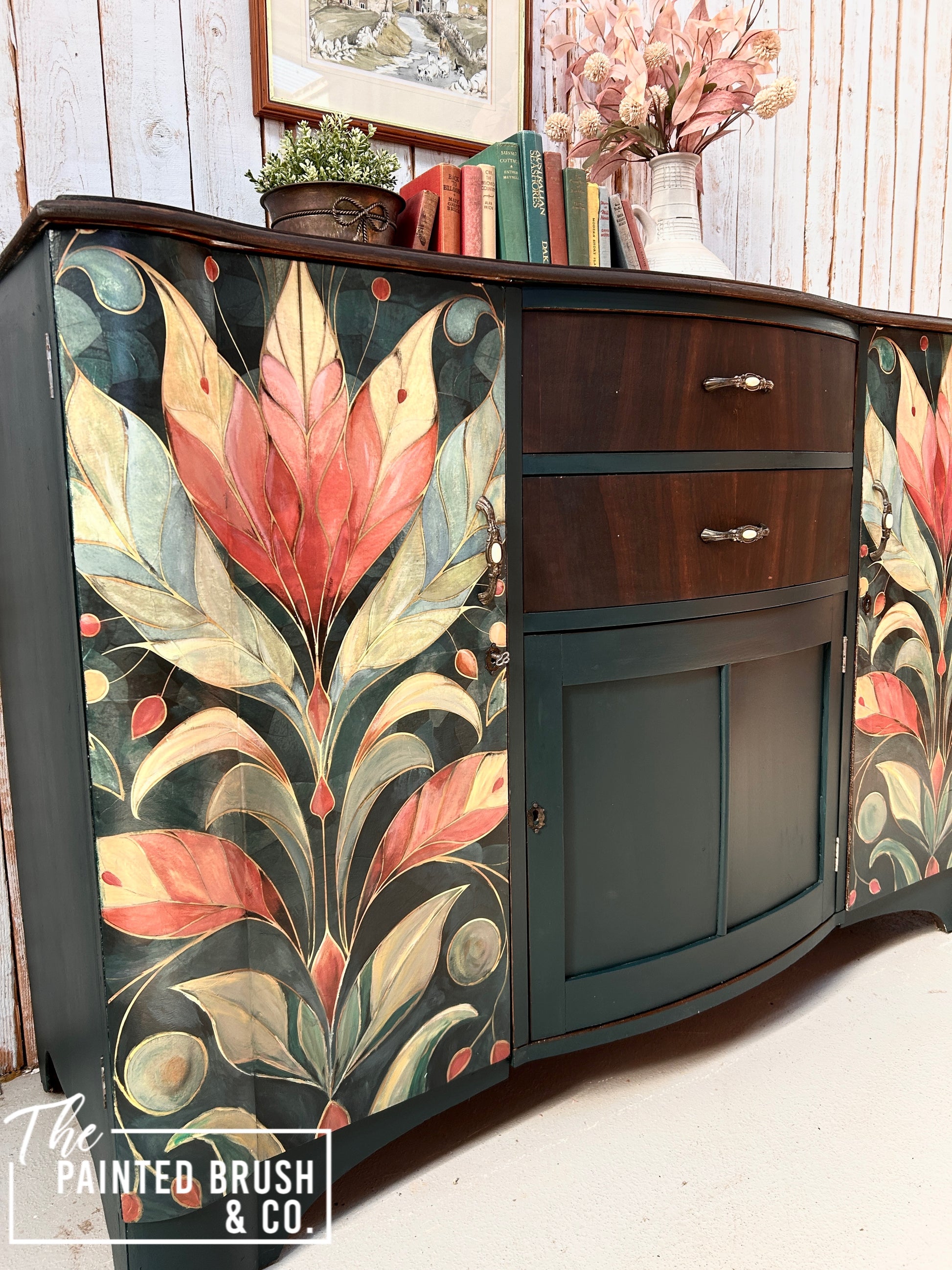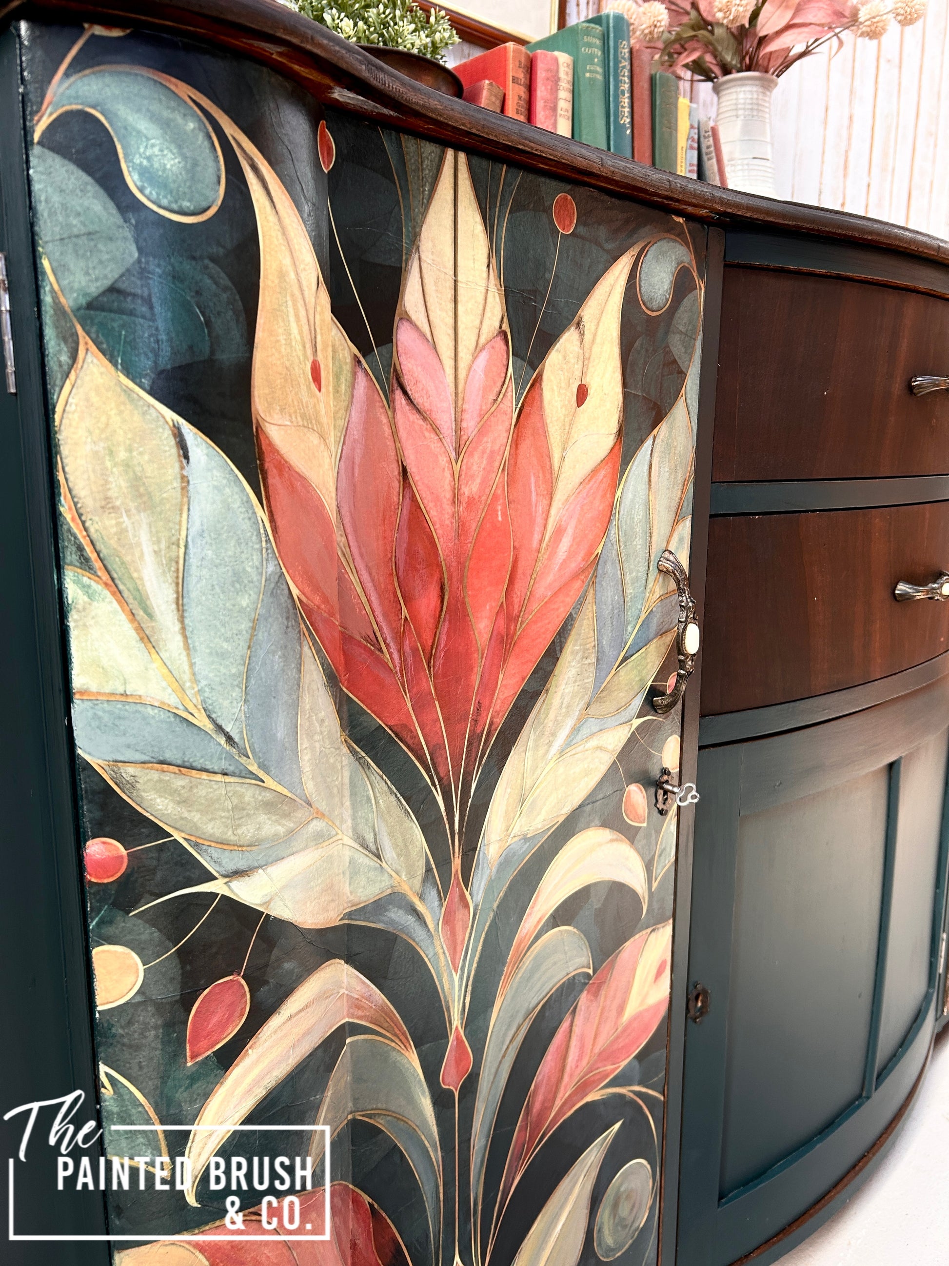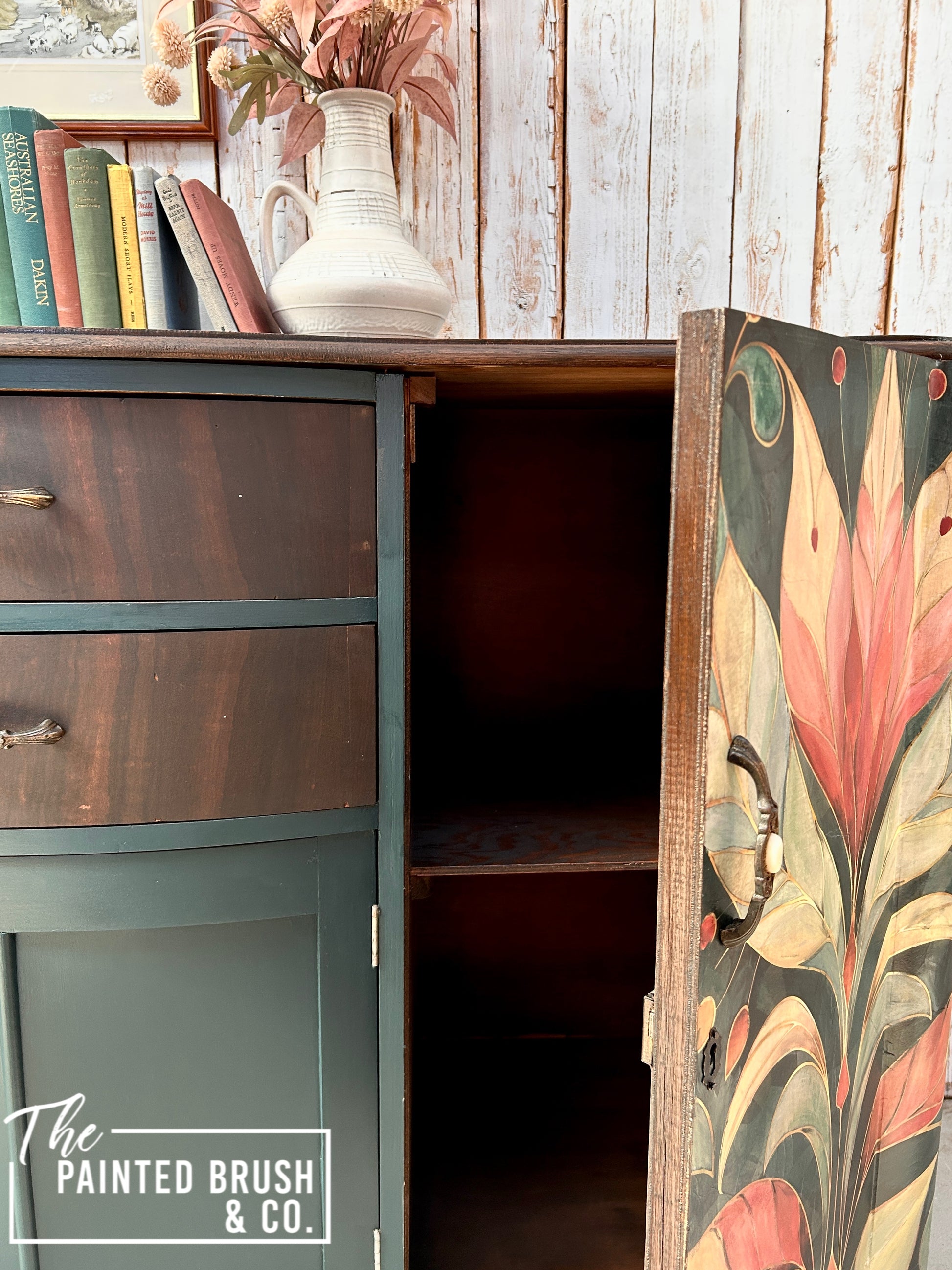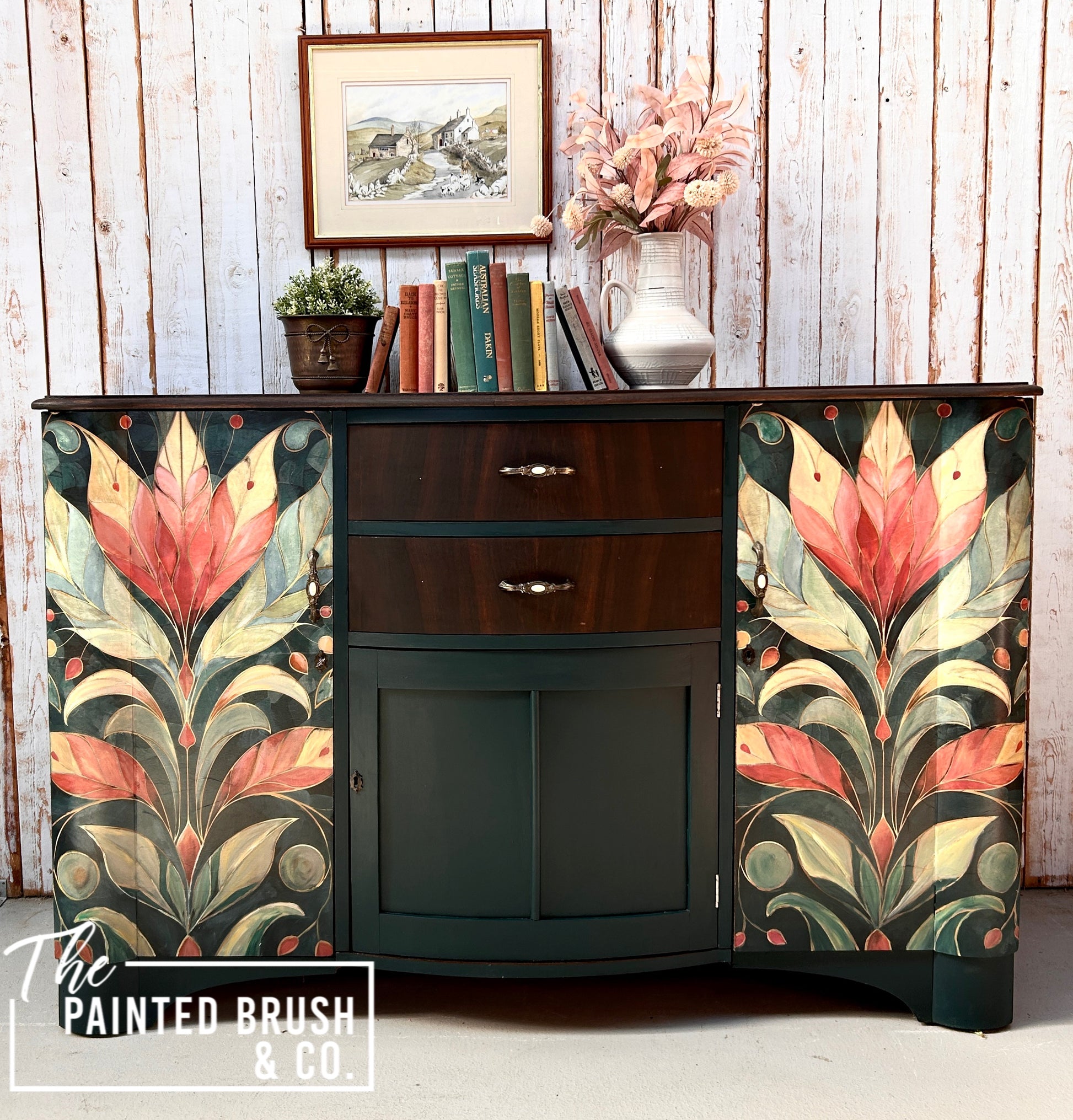 This stunning sideboard has been restored and refinished showcasing its beautiful curves. Hand painted with Pureco Silk Finish - Rainforest a deep rich green. The two doors have been decoupaged with a beautiful paper then hand painted creating two one of a kind artworks, full of rich colour.
