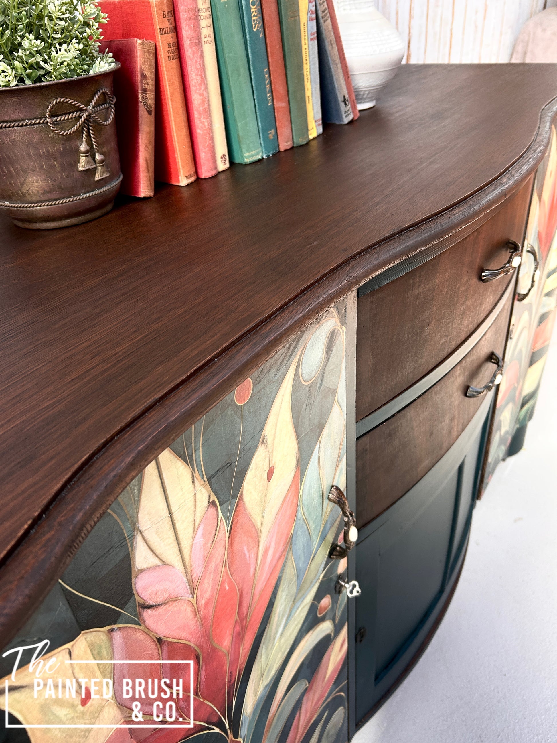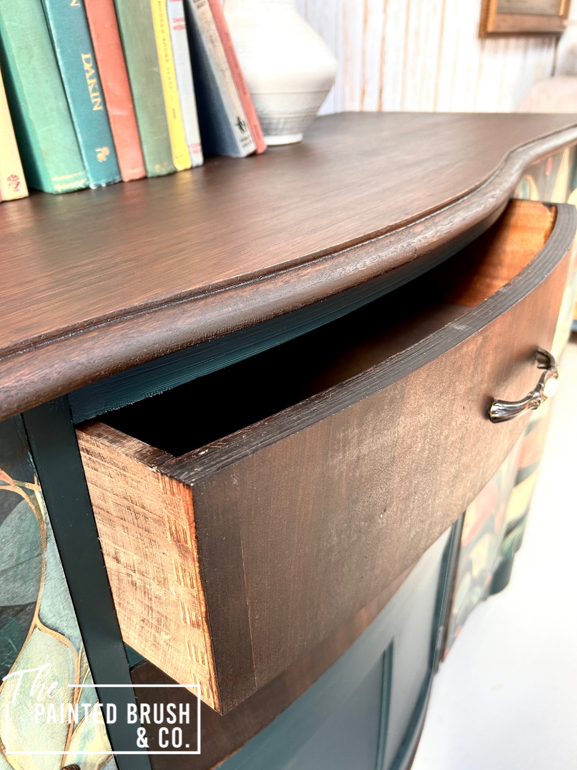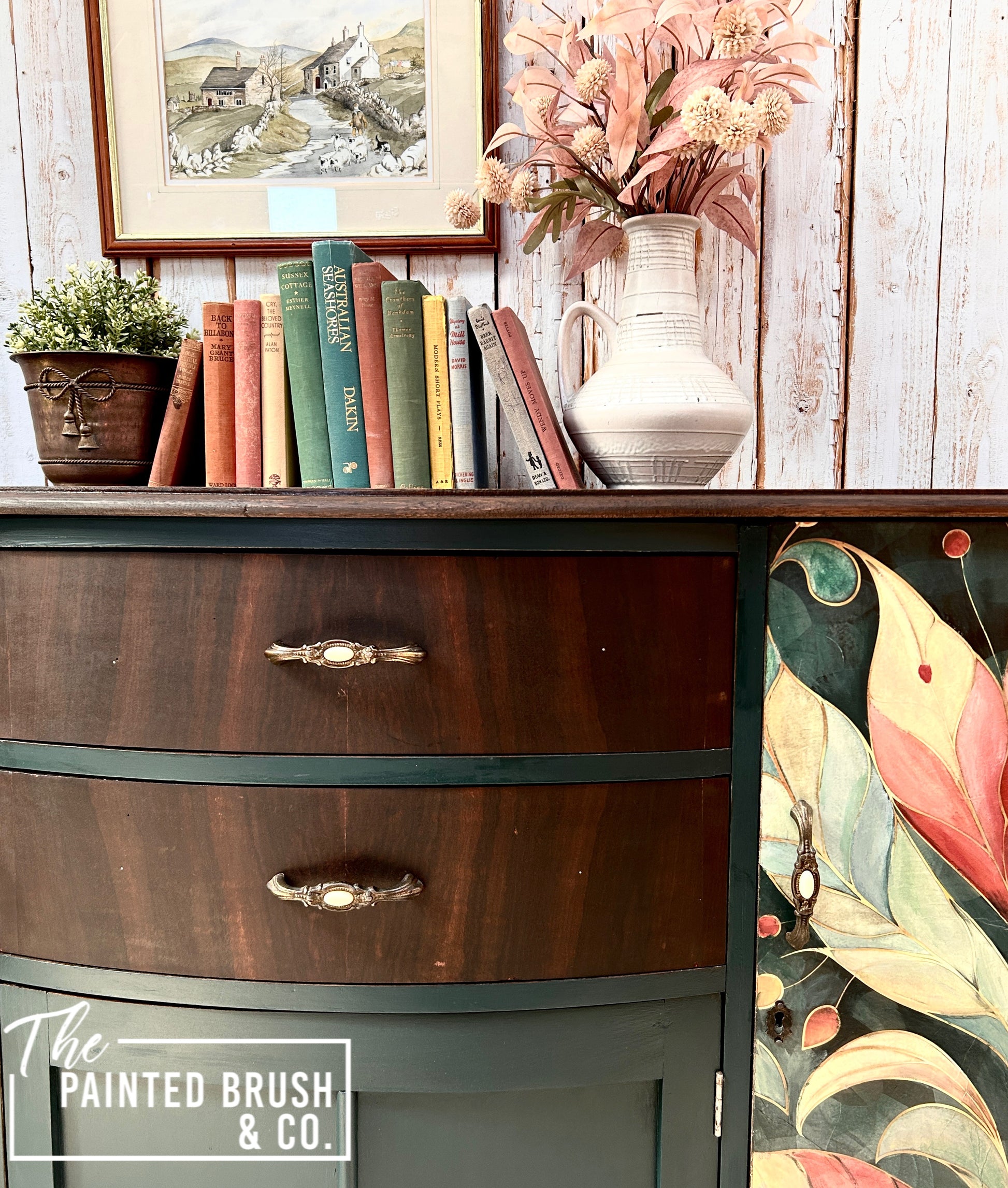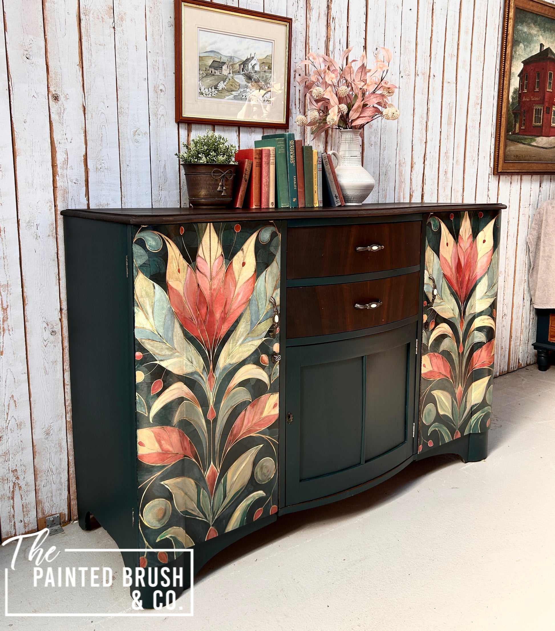 This stunning sideboard has been restored and refinished showcasing its beautiful curves. Hand painted with Pureco Silk Finish - Rainforest a deep rich green. The two doors have been decoupaged with a beautiful paper then hand painted creating two one of a kind artworks, full of rich colour.