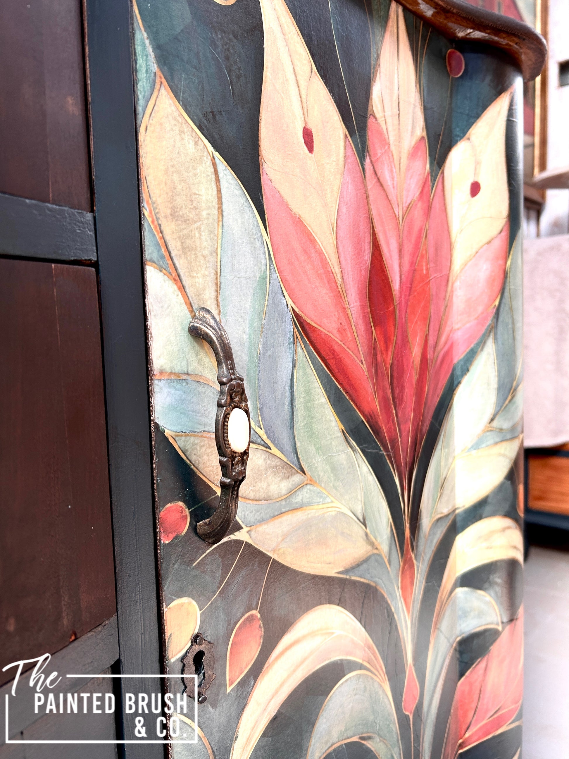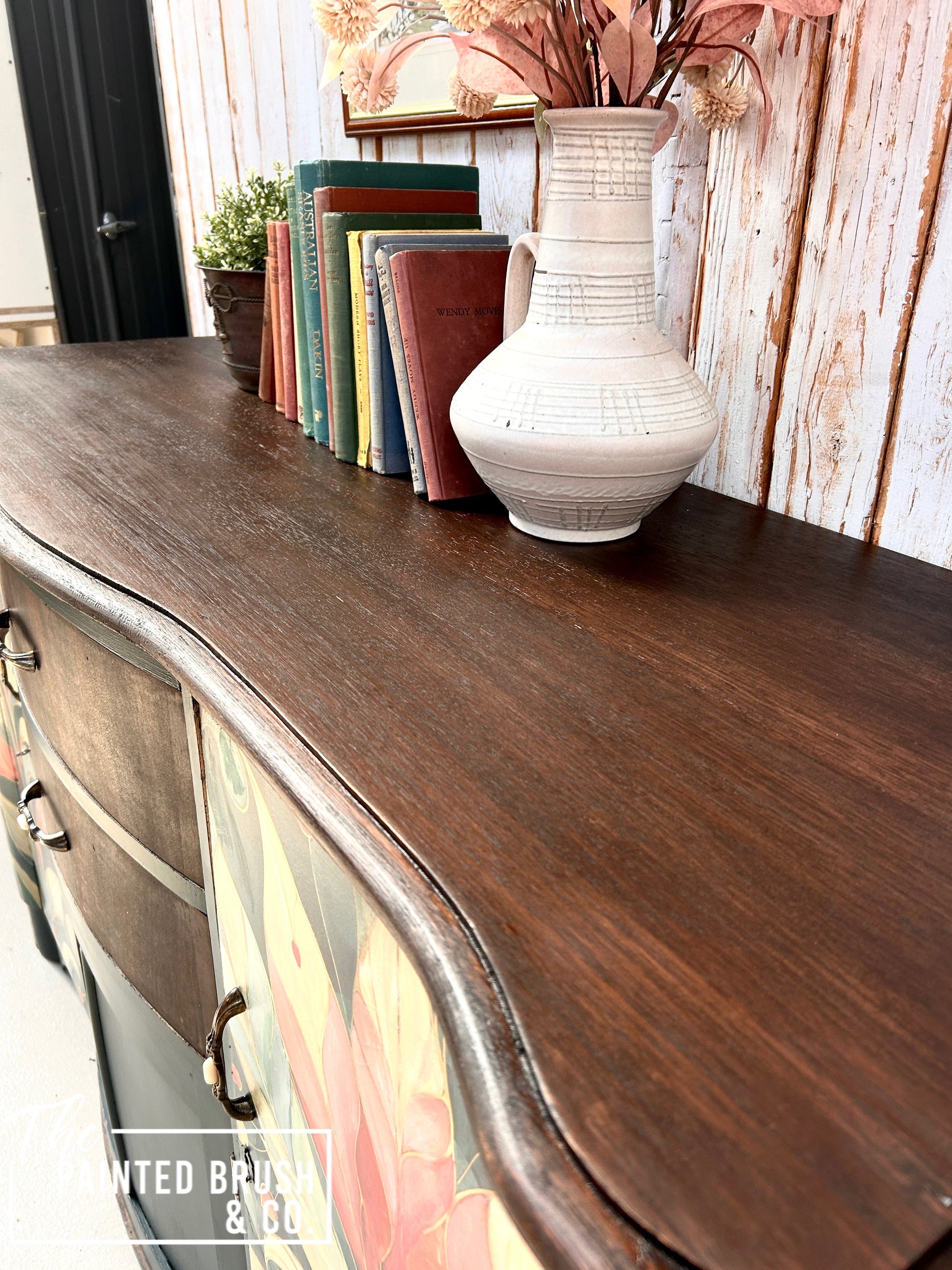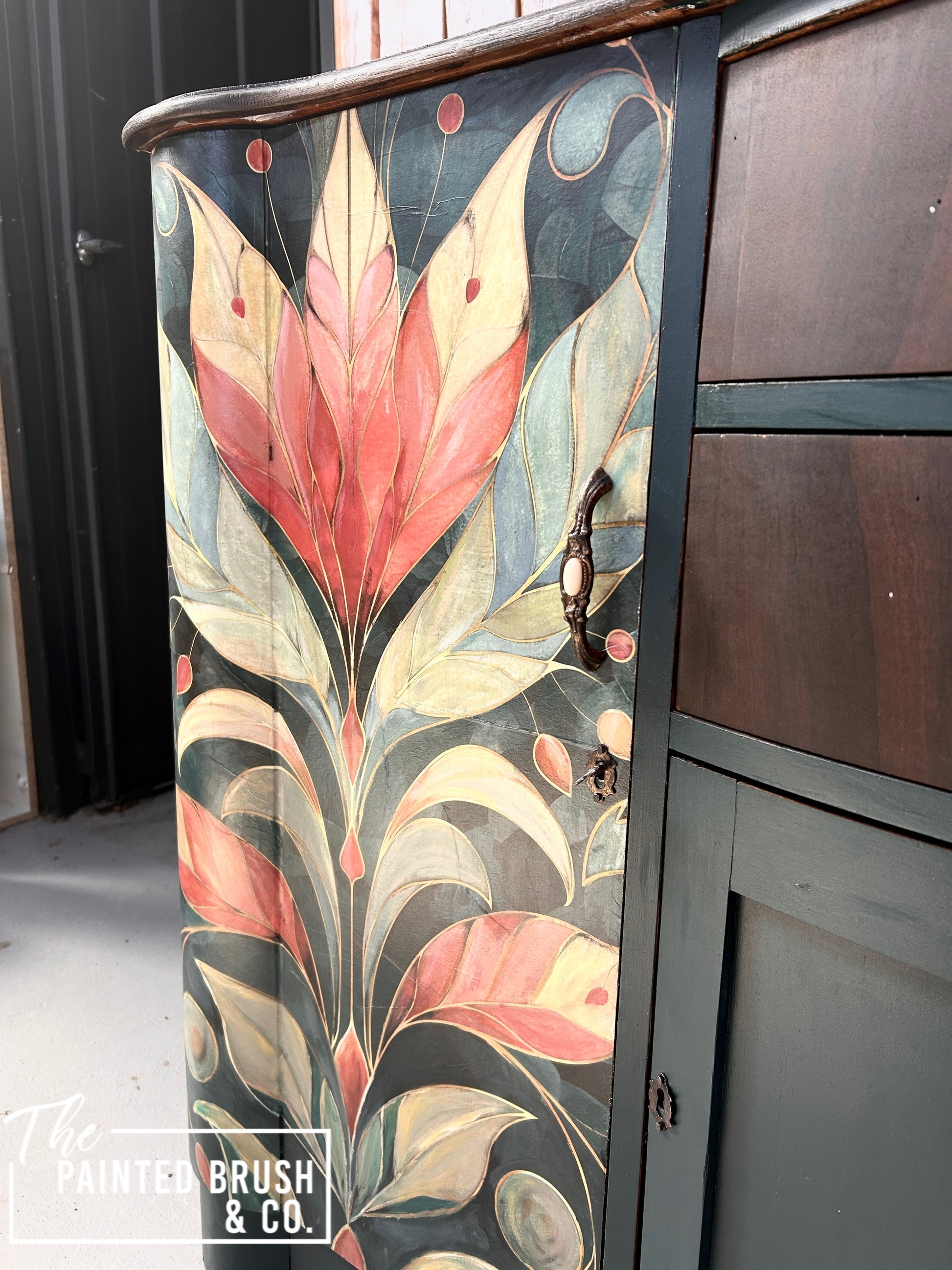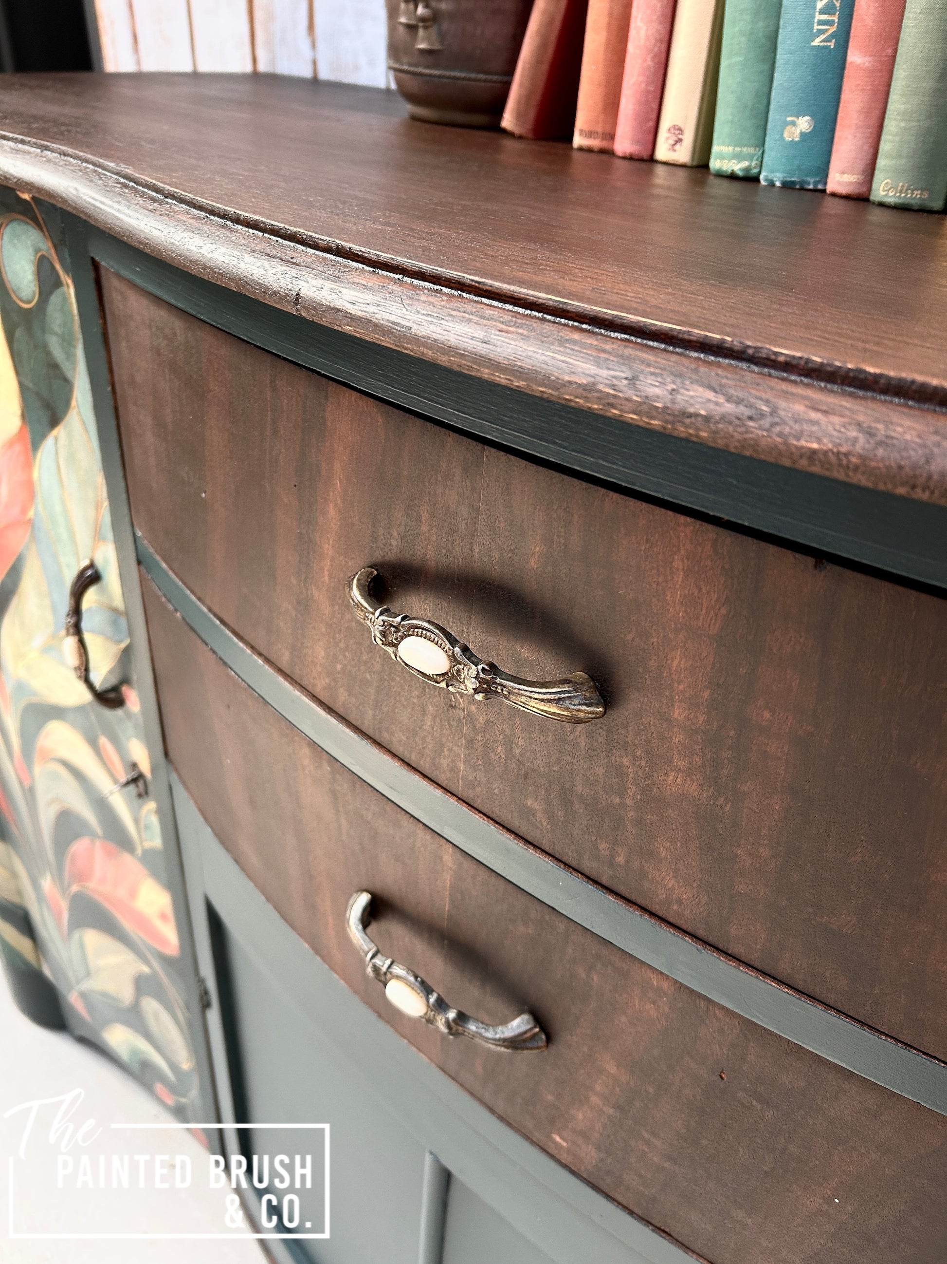 This stunning sideboard has been restored and refinished showcasing its beautiful curves. Hand painted with Pureco Silk Finish - Rainforest a deep rich green. The two doors have been decoupaged with a beautiful paper then hand painted creating two one of a kind artworks, full of rich colour.