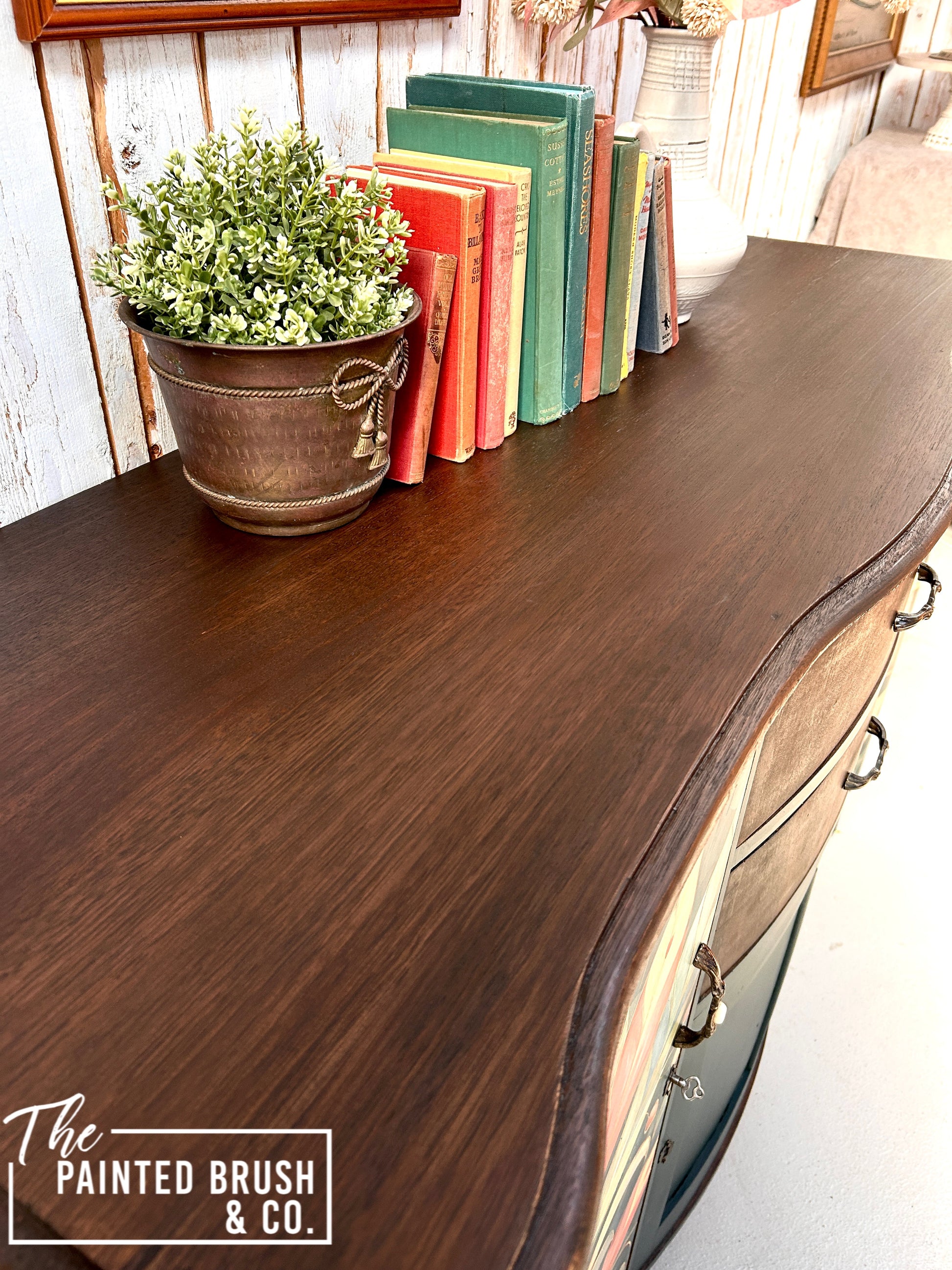 The solid oak top has been restored, stripped of the damaged finish and stained with Pureco Stain & Glaze - Sable a deep chocolate brown to complement the drawers. It has also been sealed with Pureco Hemp Finishing Oil.